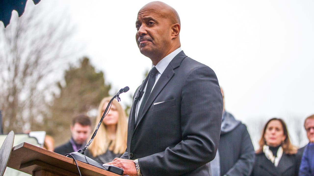 Indiana Attorney General Curtis Hill speaks at a burial service, Wednesday, Feb. 12, 2020, at Southlawn Cemetery in South Bend, Ind., for the more than 2,400 fetal remains found at the home of an abortion doctor. (South Bend Tribune via AP)