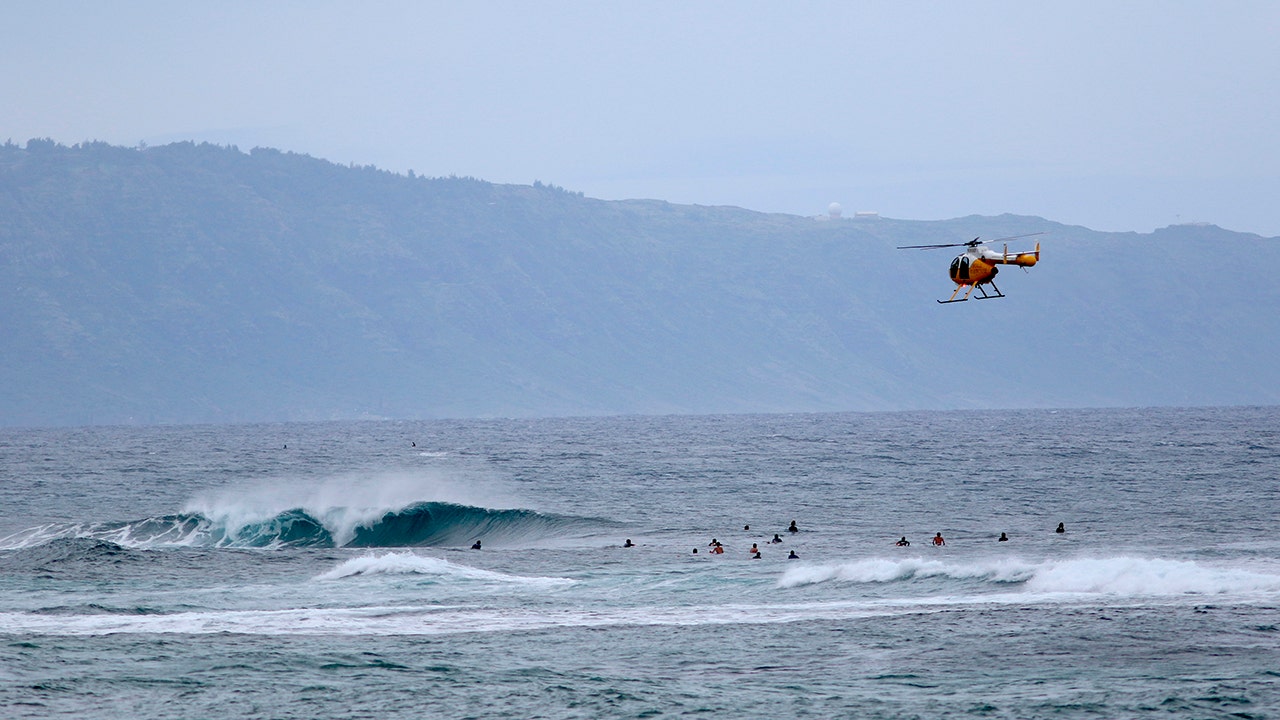 A fire and rescue helicopter flies over a group of surfers on Oahu's North Shore near Haleiwa, Hawaii on March 31, 2020. (AP Photo/Caleb Jones,File)