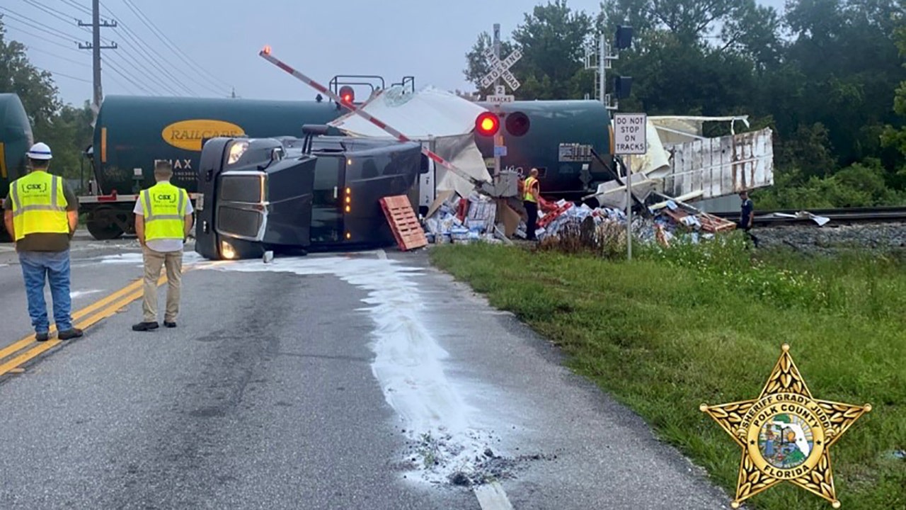 A train smashed into a semi-truck at a railroad crossing in Florida early Sunday, spilling a load of Pedialyte onto the roadway, authorities said.