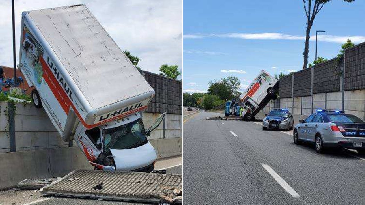 A driver of a U-Haul driver managed to walk away without major injuries after crashing through a retaining wall and ending up on an interstate highway ramp on Saturday. (Virginia State Police)