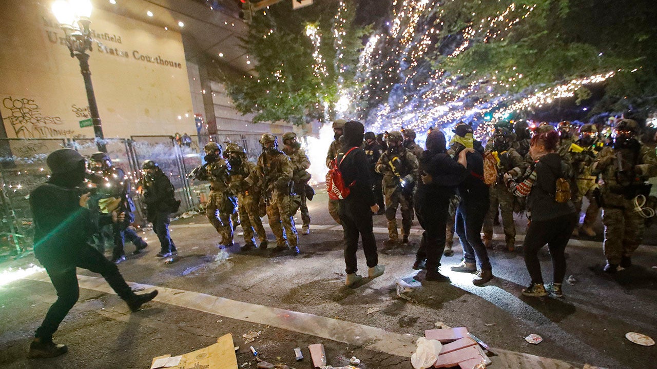 Federal officers advance on demonstrators during a Black Lives Matter protest at the Mark O. Hatfield United States Courthouse Saturday, July 25, 2020, in Portland, Ore. (Associated Press)