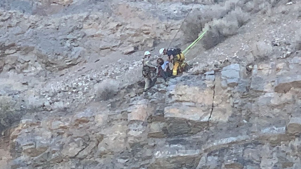 Fire crews arrived and used harnesses to rappel down the face of the sheer cliff and reach the man. Video shows rescue workers lowering the man on a gurney down the cliff.