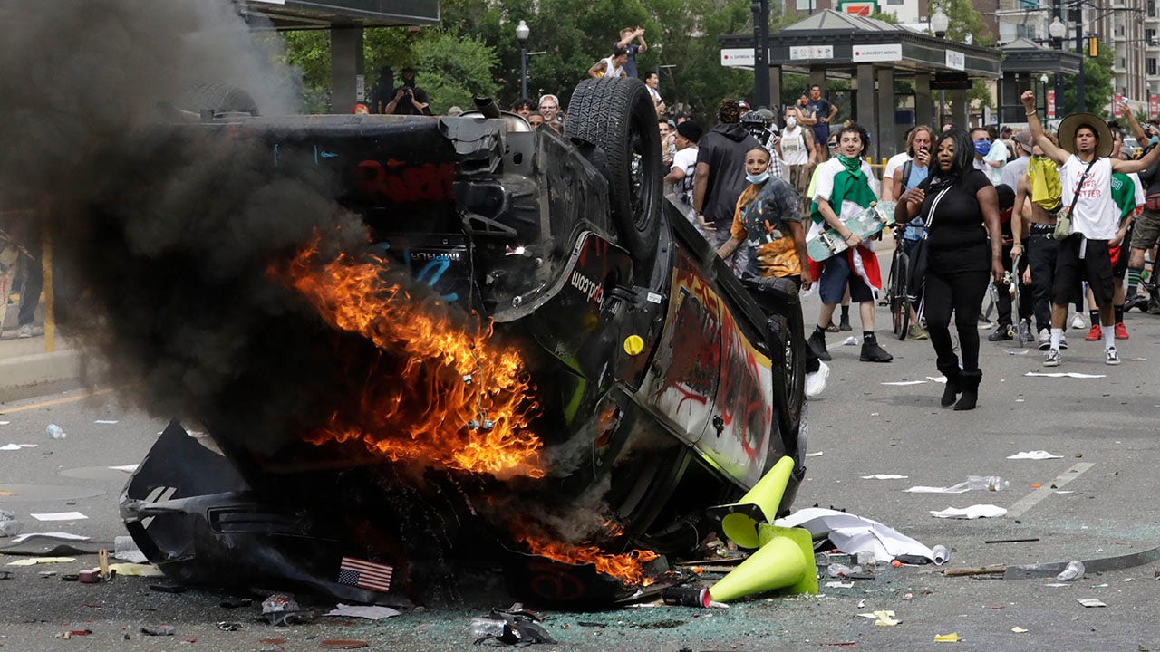 Monico Isidro Romero, 31, of Salt Lake City, is accused of pushing a yellow flag with a wooden handle through the patrol car’s windshield after it was flipped on its side, FOX13 Salt Lake City reported. He faces charges of criminal mischief, a first-degree felony, and rioting, a third-degree felony.