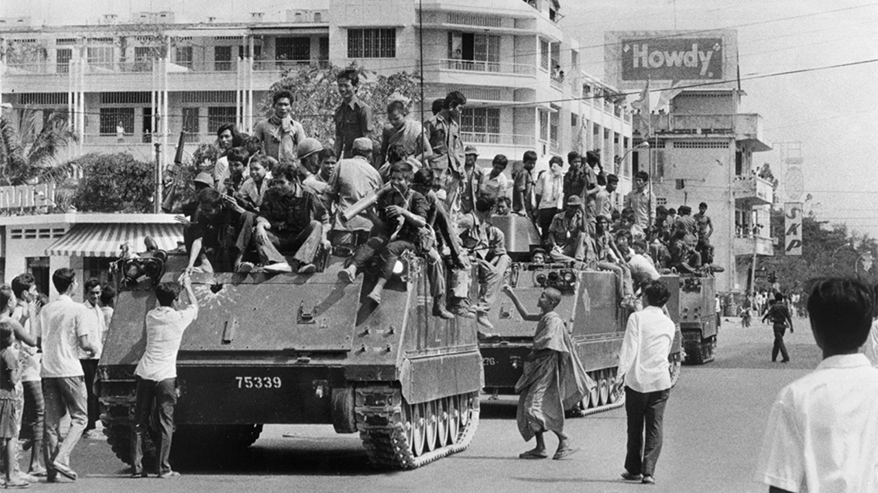 Khmer Rouge soldiers atop US-made armored vehicles in Phnom Penh, Cambodia, in April 1975. (SJOBERG/AFP/Getty Images, File)