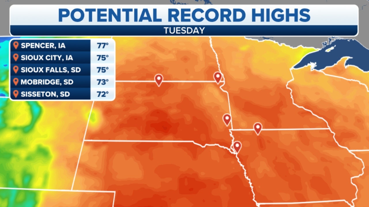 Some cities in the northern Plains may see daily record high temperatures on Tuesday.
