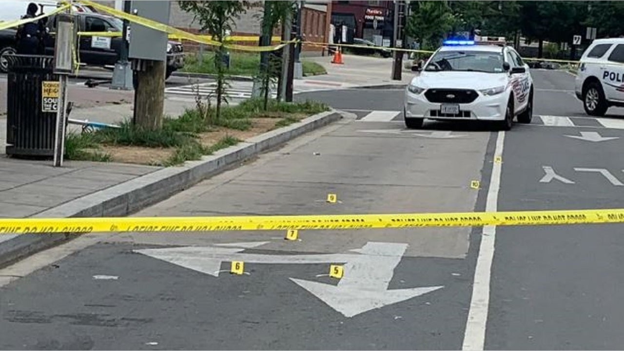 Yellow markers denote bullet casings after three people were injured during a shooting Friday in Washington D.C. (FOX DC)