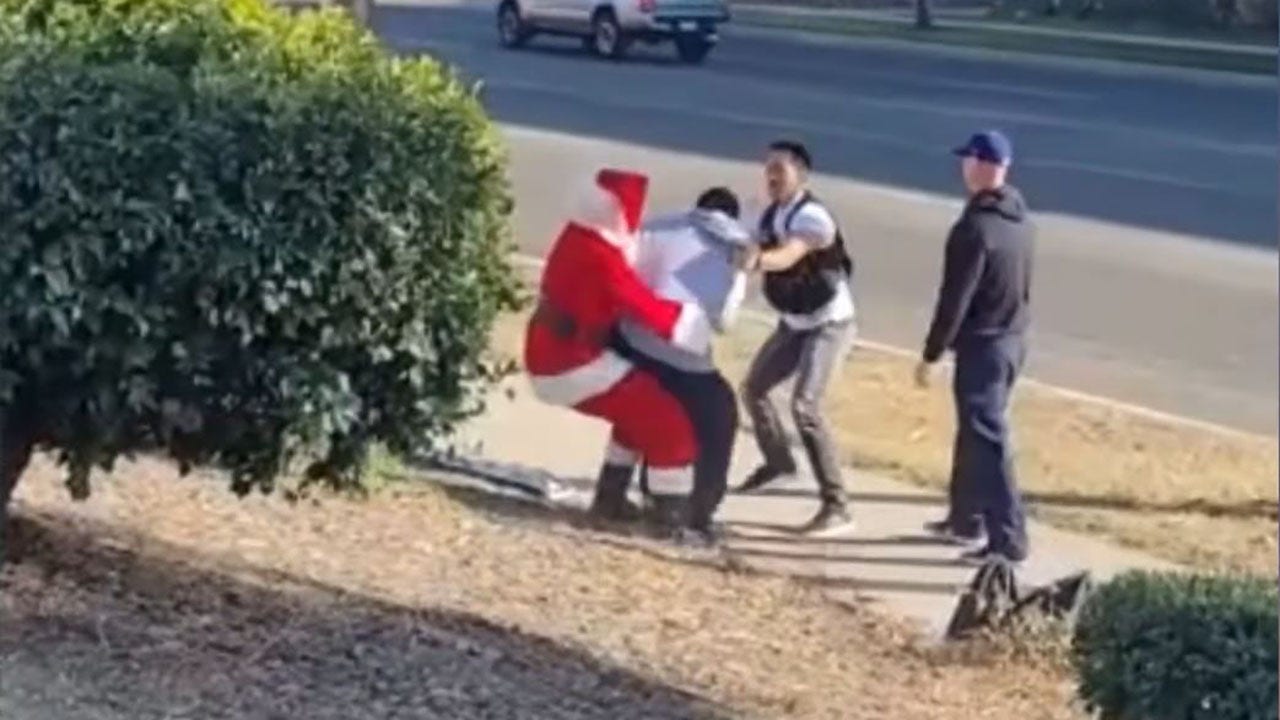 The video also shows the Santa running up to the other suspected car thief, grabbing him from behind and wrestling him to the ground.