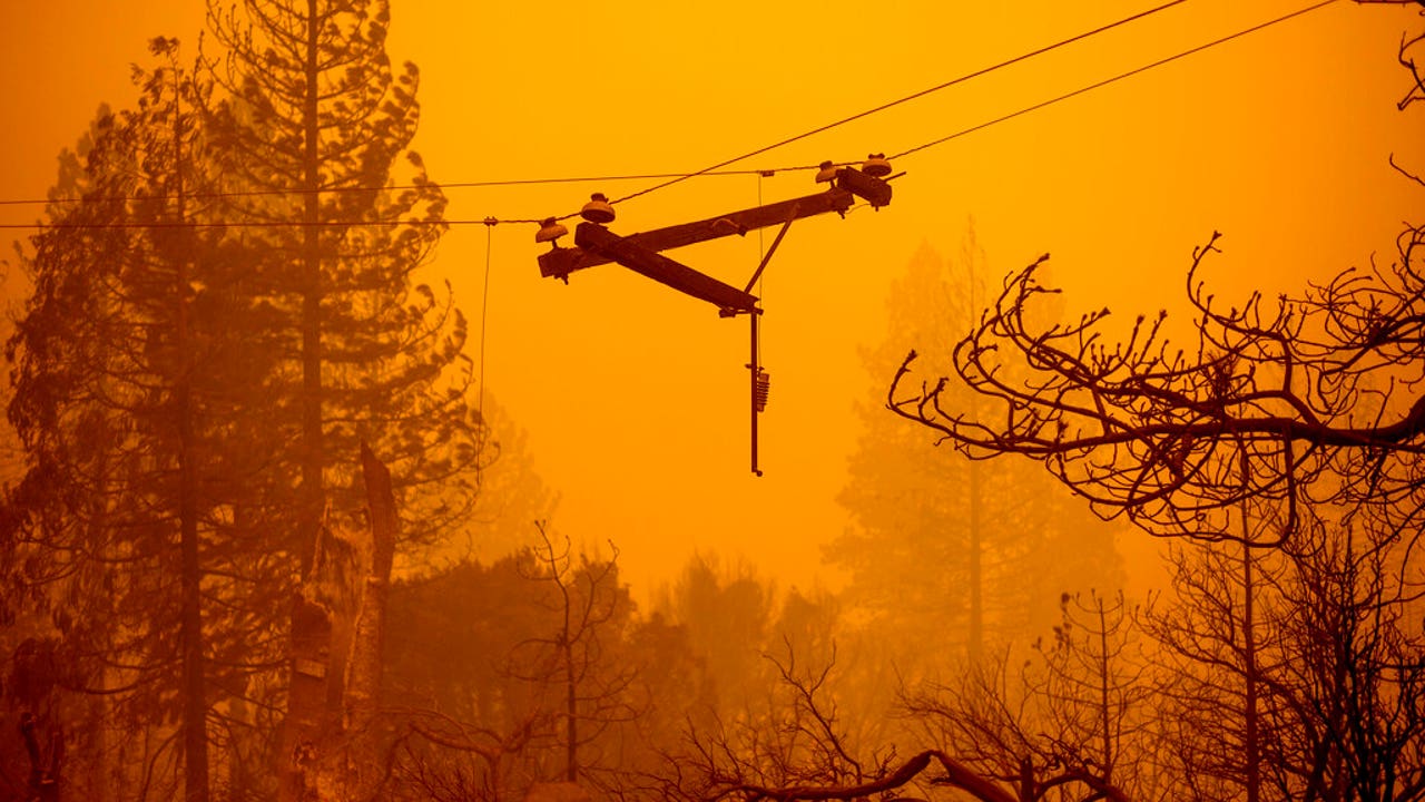 A power line dangles along Auberry Road following the Creek Fire on Tuesday, Sept. 8, 2020, in Fresno County, Calif. (AP Photo/Noah Berger)