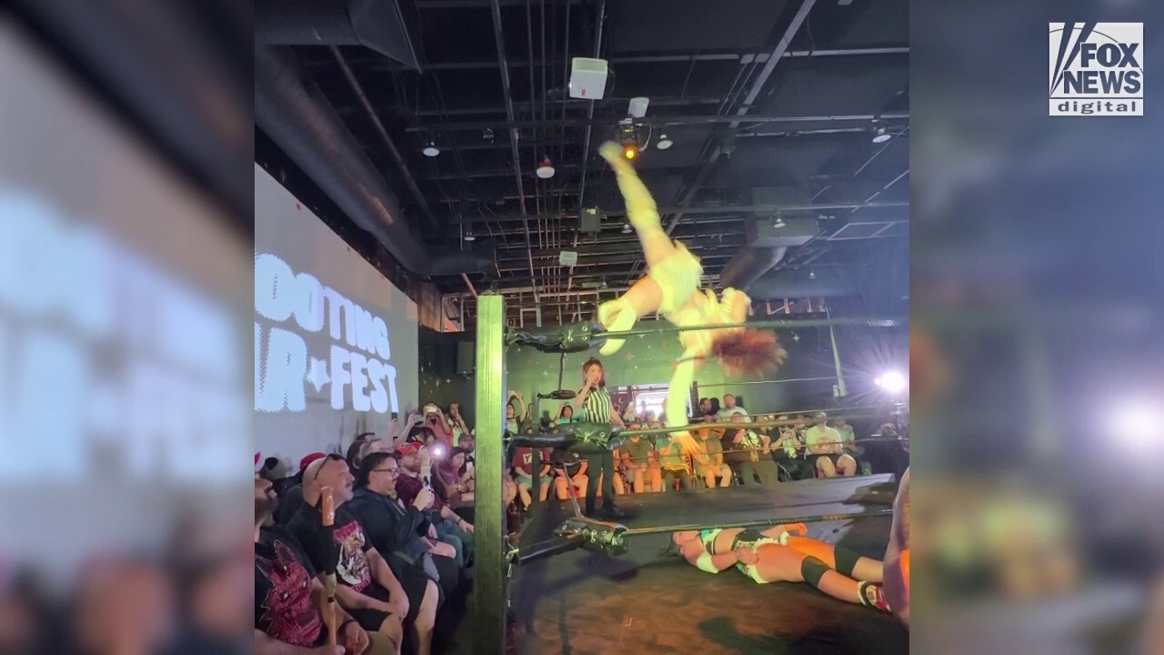Japanese wrestler Natsupoi hits a cartwheel body press for a win over Johnnie Robbie at Pandemonium: Pro Wrestling in Las Vegas.