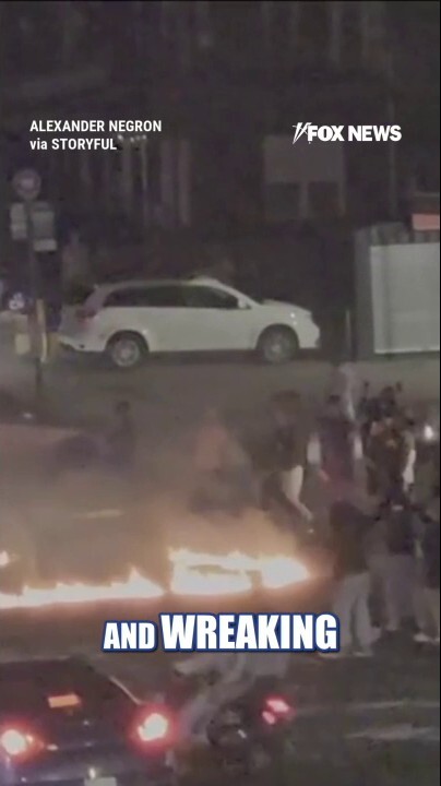 A reckless street takeover involving more than 100 cars erupted in Maspeth, Queens, early Saturday morning, as a mob waving Palestinian flags ignited fires and jumped on an NYPD patrol car, cracking its windshield.
