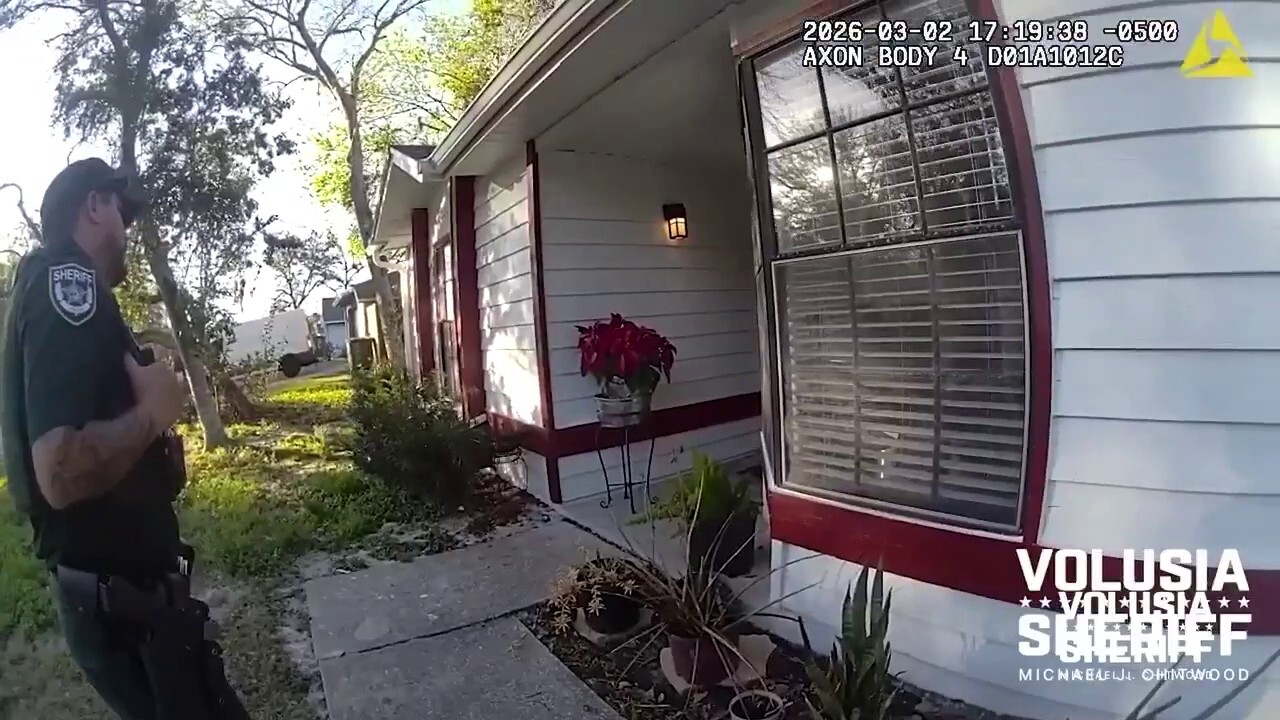 Body camera video shows the moment Luis Diaz Polanco allegedly exited his home and began firing on officers, striking Deputy Jose Rivera, in Volusia County, Florida on Sunday, March 1, 2026. (Volusia County Sheriff’s Office)