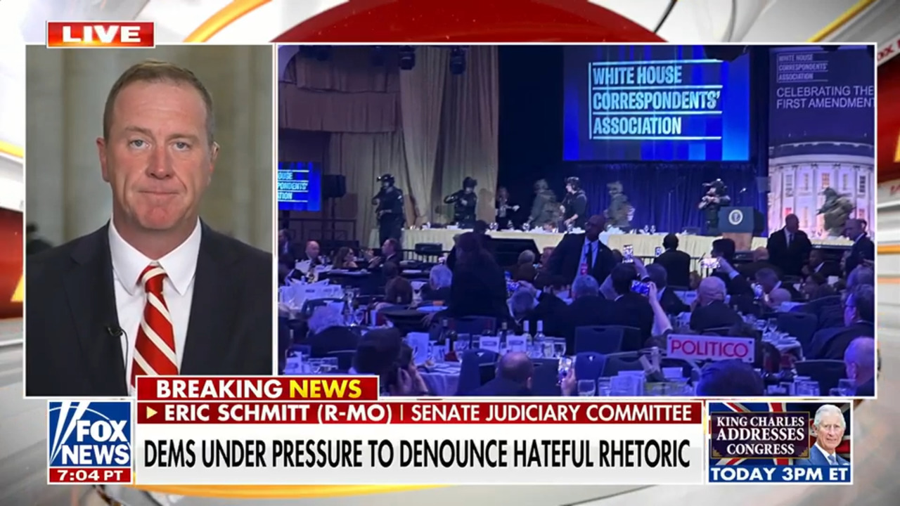 Following the WHCA Dinner shooting, the White House condemns far-left incendiary rhetoric targeting President Donald Trump. Sen. Eric Schmitt, R-Mo., discusses legislation to build a secure White House ballroom after multiple assassination attempts on the commander-in-chief in less than two years. Experts analyze the charges against the suspect and the broader implications of political violence, as Trump prepares to host King Charles III.