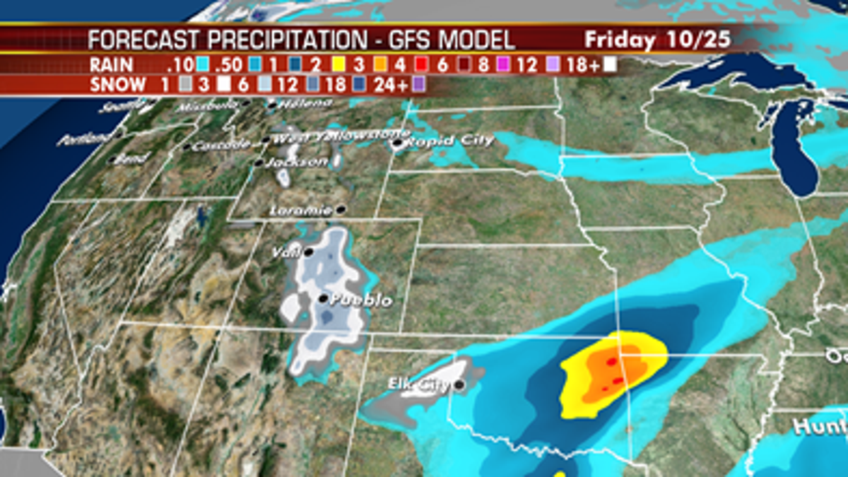 A new system and associated cold front moving into the Plains will bring up to a foot of heavy snow across parts of the Colorado Rockies including the Denver metro area. It may be cold enough for snow for some in New Mexico and the panhandle of Texas for a brief period of time.