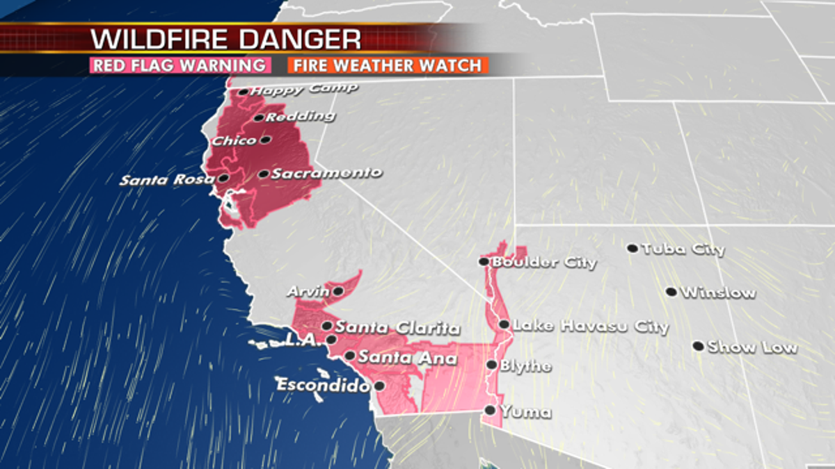 Extremely critical fire weather conditions continue over parts of California today and tomorrow. Powerful, strong offshore winds will combine with low relative humidity and warm temperatures to create very favorable conditions for rapid fire growth for existing and new fires.