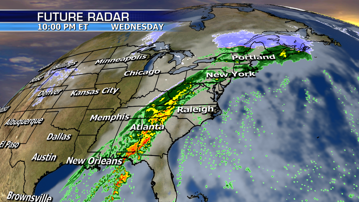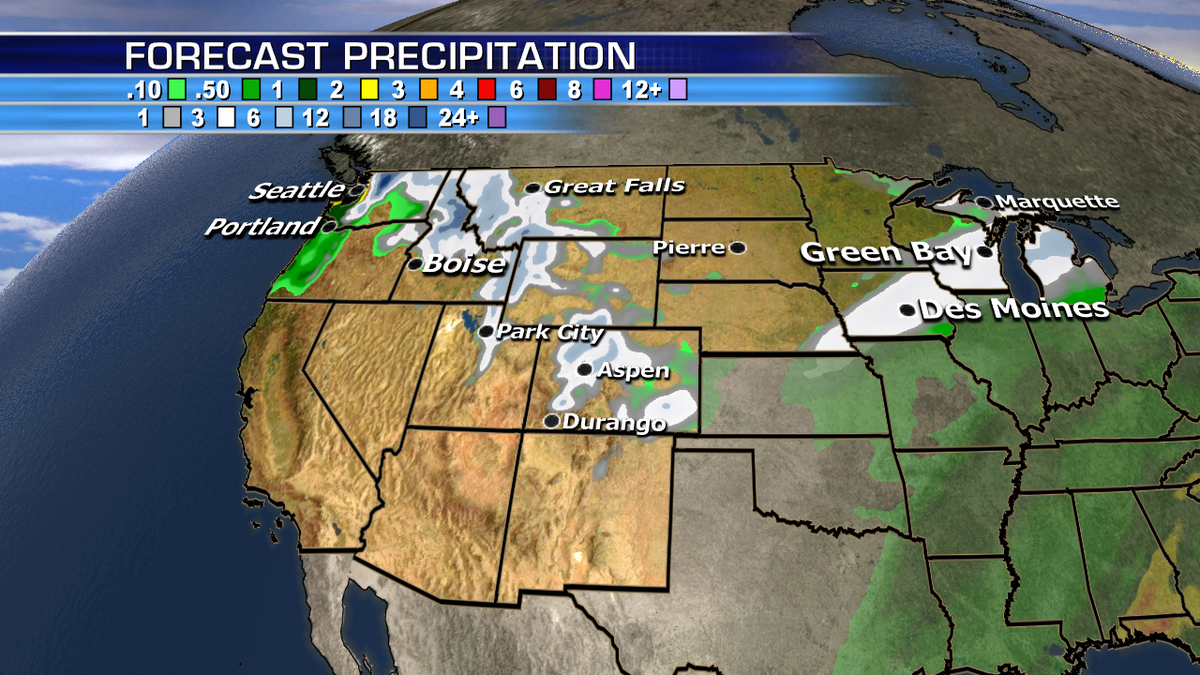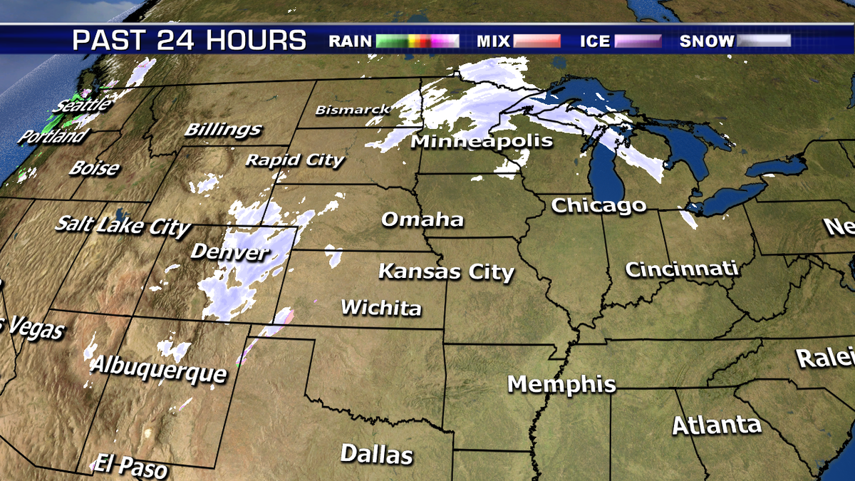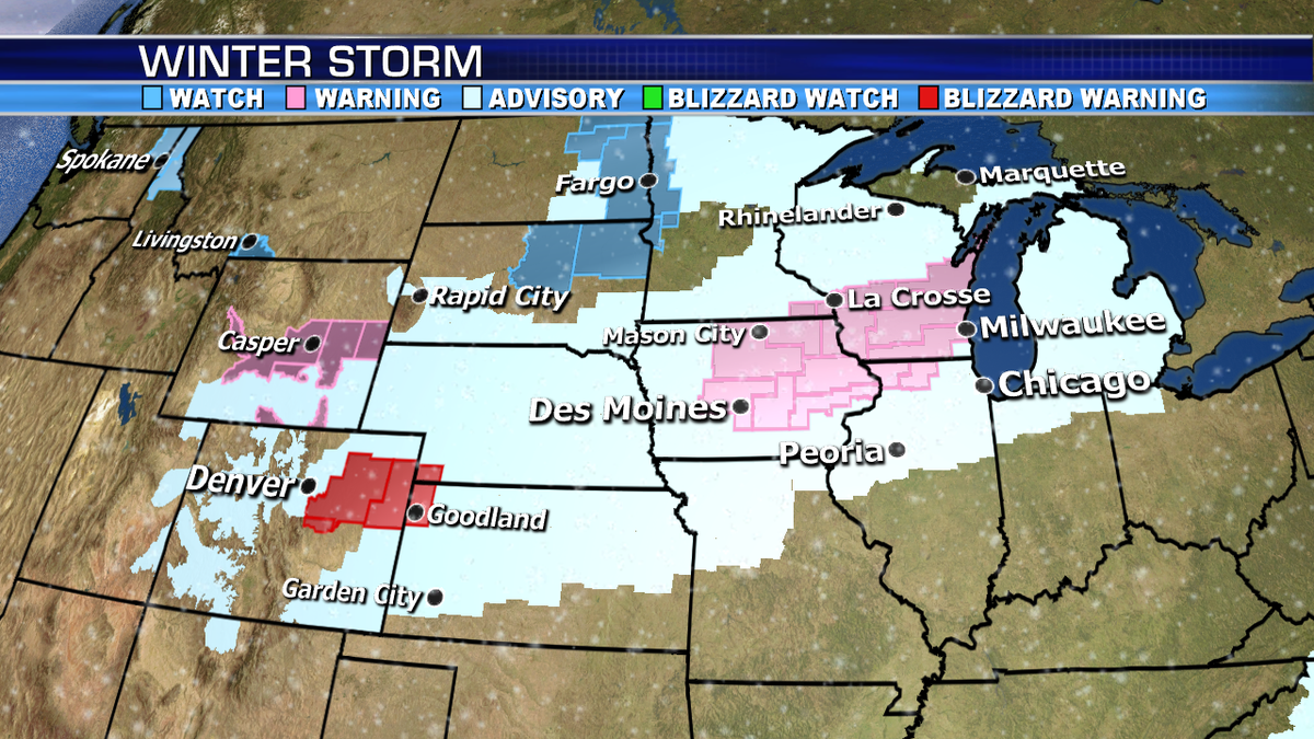 Snow, rain, and freezing rain will stretch from the Front Range and Plains to the Midwest today. Wind gusts to 50mph are also creating whiteout and blizzard conditions across northeastern Colorado and northwestern Kansas. This wintry precipitation reaches the interior Northeast on Wednesday.