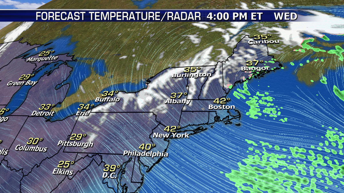 More snow will fall today across the Great Lakes and interior Northeast as wind wraps around an area of low pressure over New England.