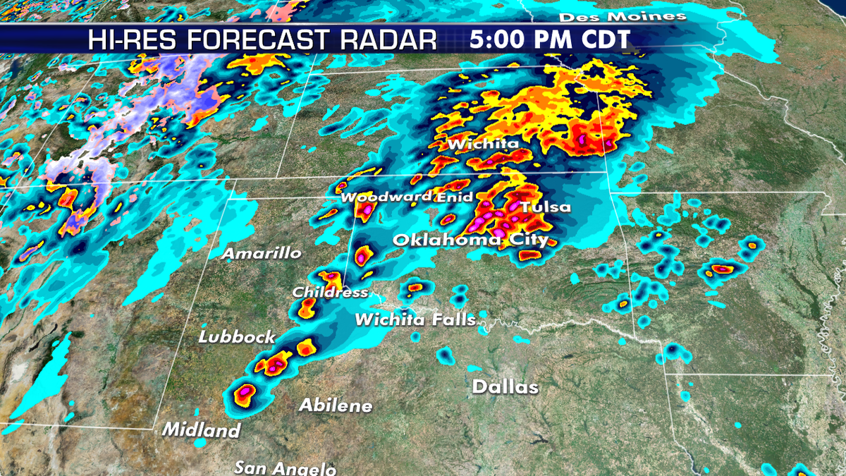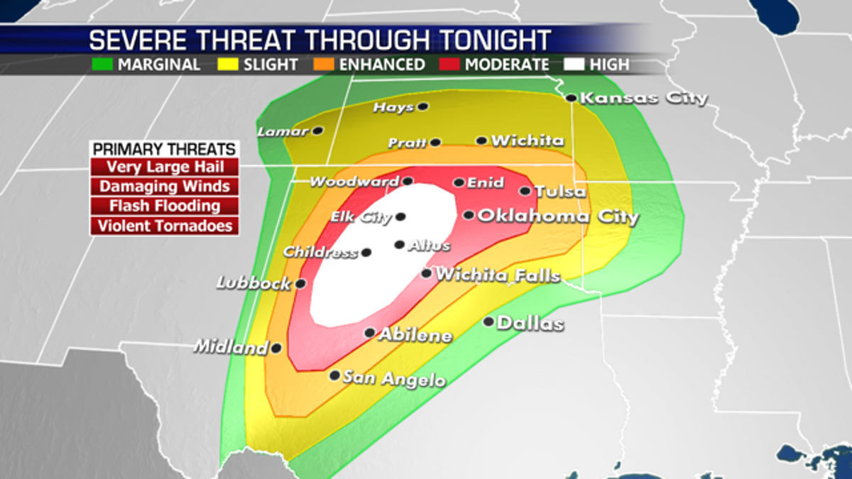 The area most likely to experience significant tornadoes stretches from the Texas Panhandle and Hill Country, through western and Central Oklahoma, and into southern Kansas.