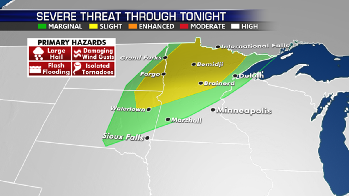 Isolated strong storms may bring damaging winds and hail to portions of the Northern Plains and Upper Midwest later today through tonight.