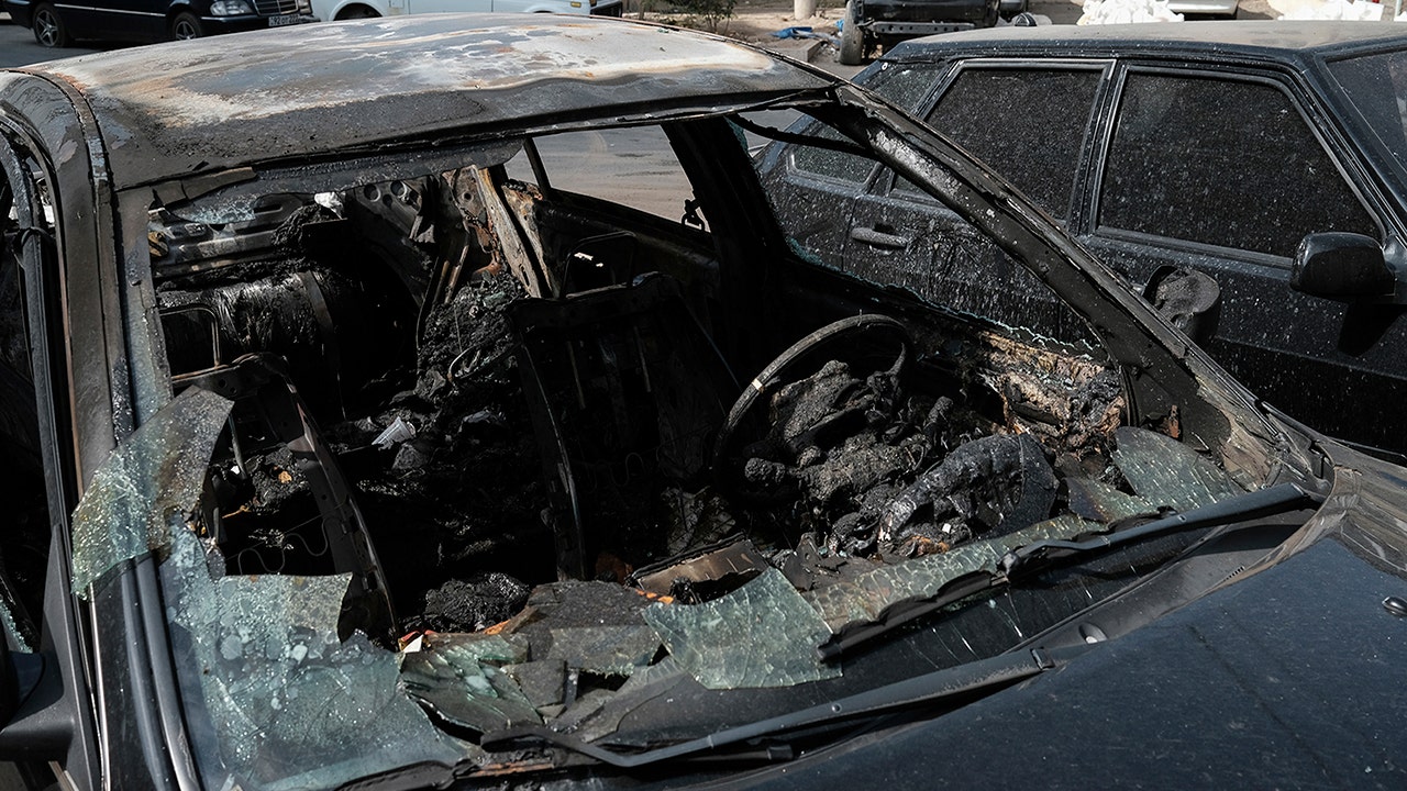 A car destroyed by shelling in Stepanakert, the self-proclaimed Republic of Nagorno-Karabakh, Azerbaijan, Tuesday, Sept. 29, 2020. Armenian and Azerbaijani forces accused each other of attacks on their territory Tuesday, as fighting over the separatist region of Nagorno-Karabakh continued for a third straight day following the reigniting of a decades-old conflict. (Areg Balayan/PAN Photo via AP)