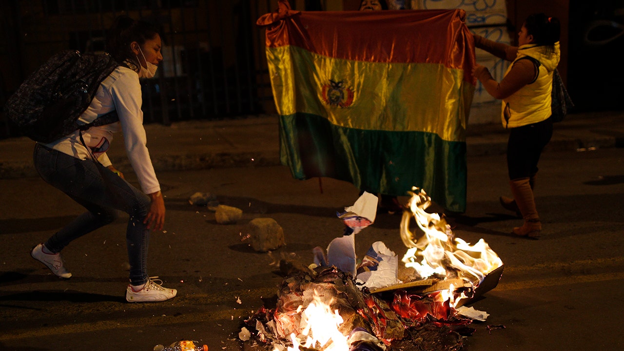 Supporters of opposition presidential candidate Carlos Mesa burn campaign posters of ruling party congressional candidates outside the Supreme Electoral Court where election ballots are being counted in La Paz, Bolivia, Monday, Oct. 21, 2019. (AP)