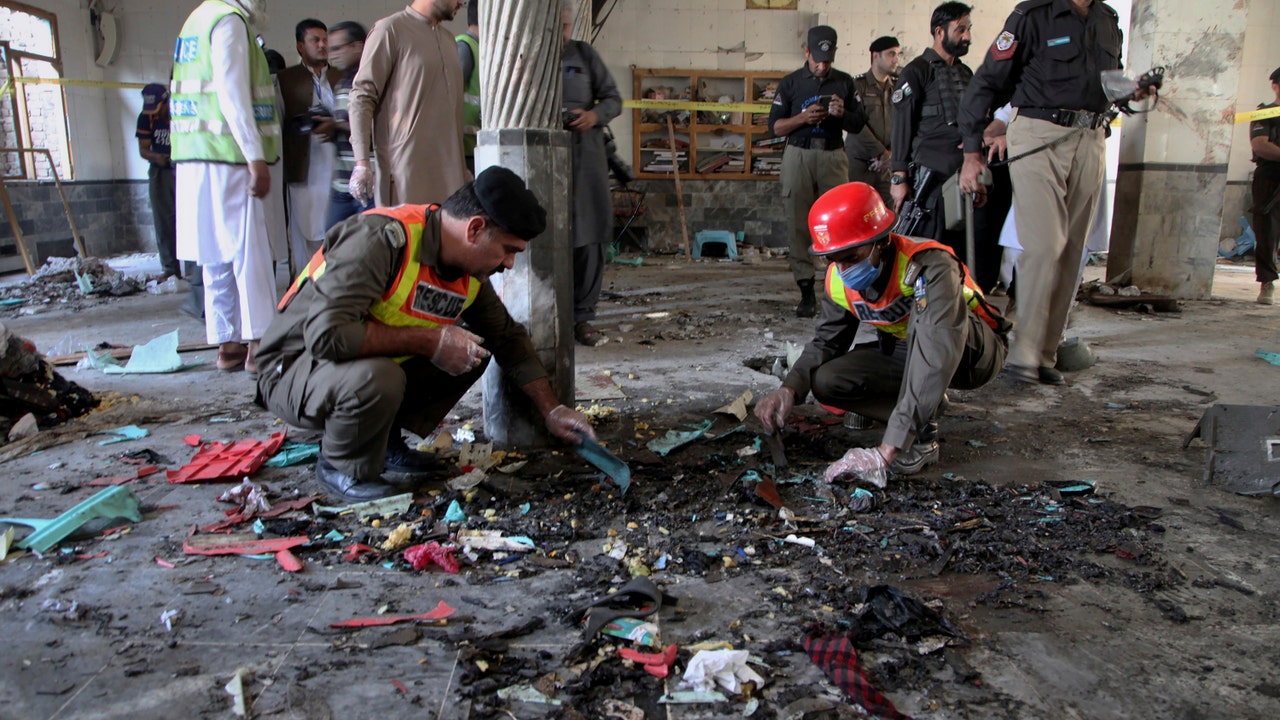 Rescue workers and police officers examine the site of a bomb explosion in an Islamic seminary in Peshawar, Pakistan, Tuesday, Oct. 27, 2020. (AP Photo/Muhammad Sajjad)