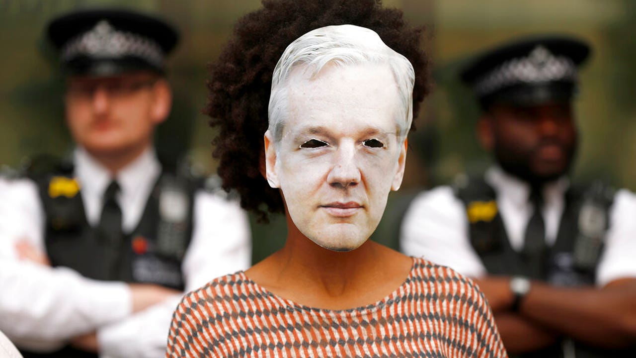 Police watch an Assange supporter wearing a mask and protesting at Westminster Magistrates Court in London, Friday, June 14, 2019. WikiLeaks founder Julian Assange is expected to appear at hearing in a London court via video link as he continues his fight against extradition to the United States. (AP)