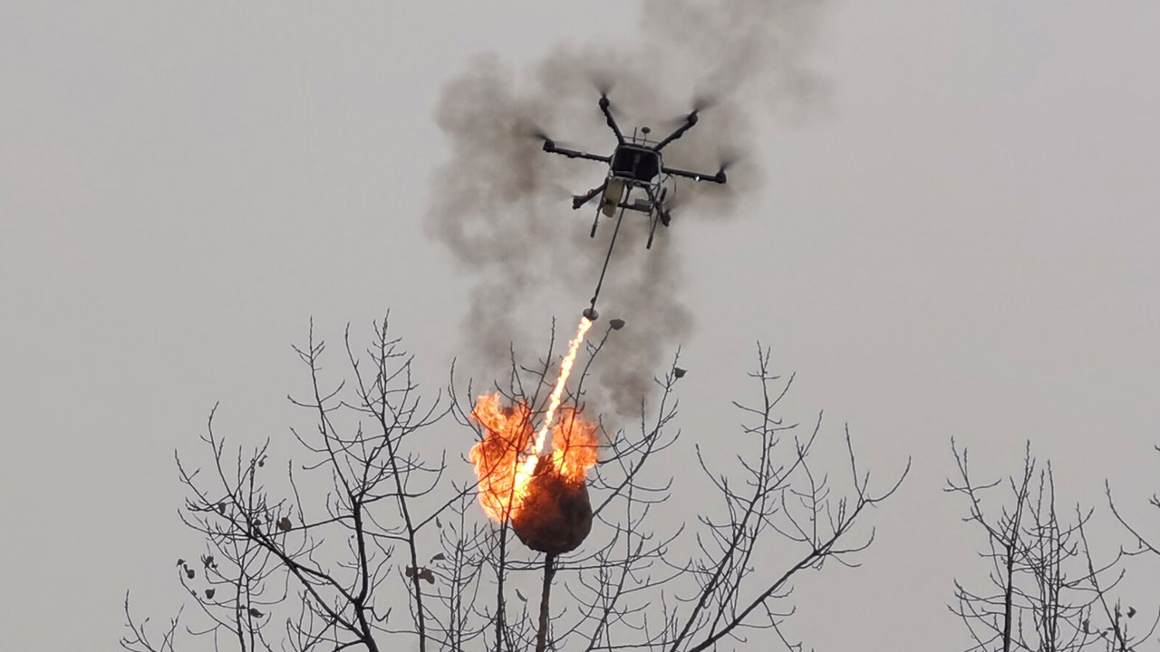 Videos released by Blue Sky show a recent mission by the six-arm drone. It hovers above a hive as large as a suitcase before swooping down. The drone operator flips the ignition switch, and the drone spits bursts of fire onto the hive.