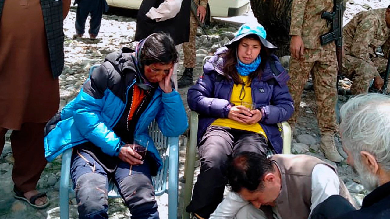 In this photo provided by Gilgit Baltistan regional police department, mountaineers receive initial treatment following their rescue, at a helipad in the town of Imit, Ghizer district of Gilgit Balistan region, Pakistan, Tuesday, Jun 18, 2019. (Gilgit Baltistan regional police department via AP)