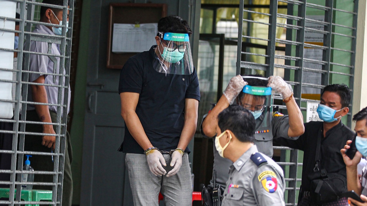 Canadian pastor David Lah covered with face shield and mask is escorted by police men as he leaves from a township court after his first court appearance Wednesday, May 20, 2020, in Yangon, Myanmar. Lah attends a court hearing related to charges filed against him for allegedly organizing public Christian activities in Yangon back in April, after the regional government banned mass gatherings in mid-March to curb the spread of the coronavirus. (AP Photo/Thein Zaw)