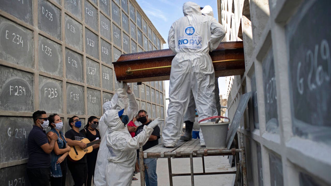The family of Carmen Valeria watch her remains as they are placed into a niche by cemetery workers at the Iraja cemetery in Rio de Janeiro, Brazil, Thursday, April 30, 2020. The family suspects the 76-year-old died from COVID-19. (AP)