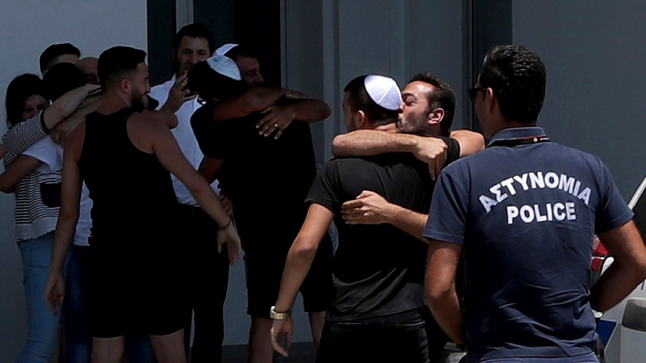 An Israeli teenager embraced by relatives after being released from Famagusta police headquarters in Paralimni, Cyprus, on Sunday. (AP Photo/Petros Karadjias)