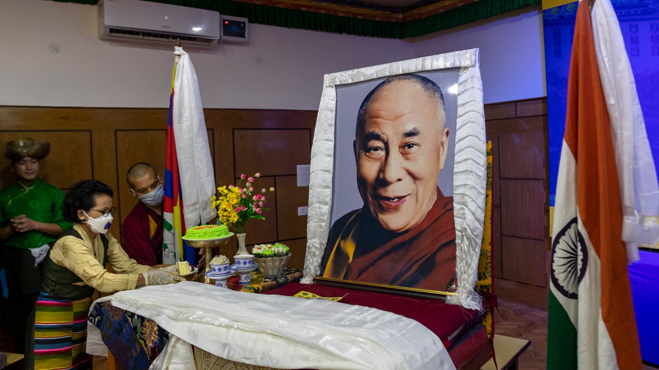 An exile Tibetan offers a piece of cake to a portrait of her spiritual leader the Dalai Lama to mark her leader's 85th birthday in Dharmsala, India, Monday, July 6, 2020. (AP Photo/Ashwini Bhatia)