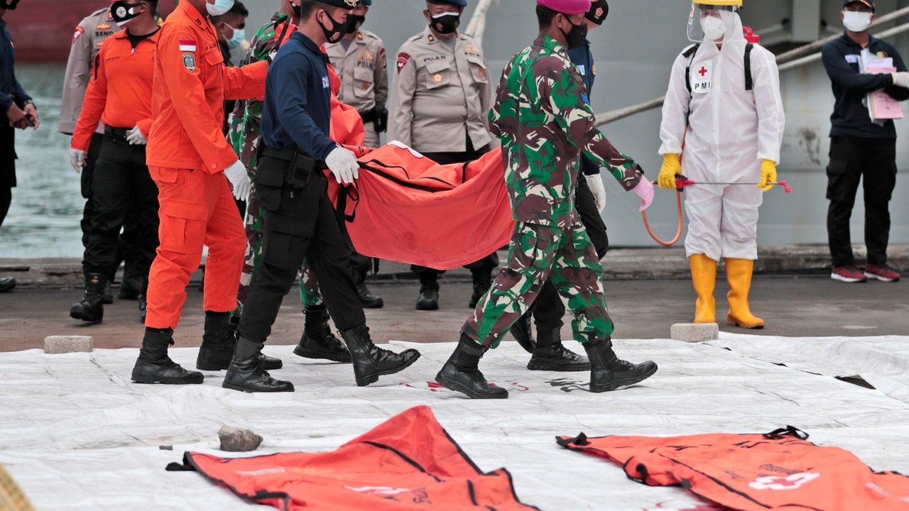 Rescuers carry a body bag of items recovered from the Sriwijaya Air passenger jet crash at Tanjung Priok Port, Tuesday, Jan. 12, 2021. Indonesian navy divers were searching through plane debris and seabed mud Tuesday looking for the black boxes of a Sriwijaya Air jet that nosedived into the Java Sea over the weekend with 62 people aboard. (AP Photo/Dita Alangkara)