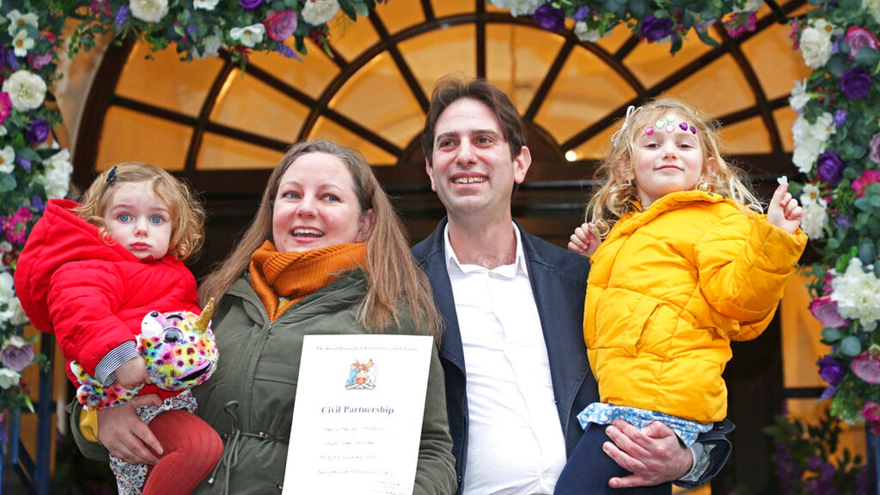 Rebecca Steinfeld and Charles Keidan, with their children Ariel and Eden, pose for the media outside at Kensington and Chelsea Register Office after registering for a civil partnership, in London, Tuesday, Dec. 31, 2019. (PA via AP)
