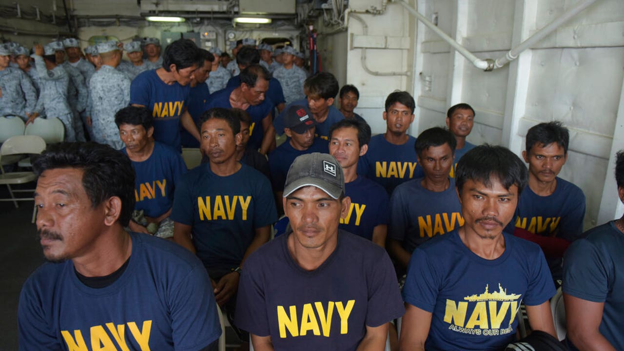 Rescued Filipino fishermen sit inside Philippine Navy ship BRP Ramon Alcuaz as they head back to shore at Occidental Mindoro province, Philippines on Friday June 14, 2019. The Philippines' top diplomat said he has filed a diplomatic protest after an anchored fishing boat was hit by a suspected Chinese vessel which then abandoned the 22 Filipino fishermen as the boat sank in the disputed South China Sea. (AP)