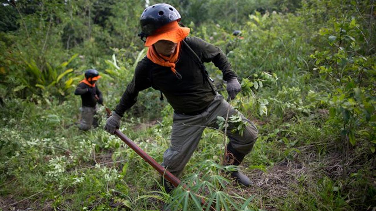 Using a shovel-handled tool with a cylindrical head, Peruvian coca eradicators tear out by their roots the plants that are used to make cocaine.