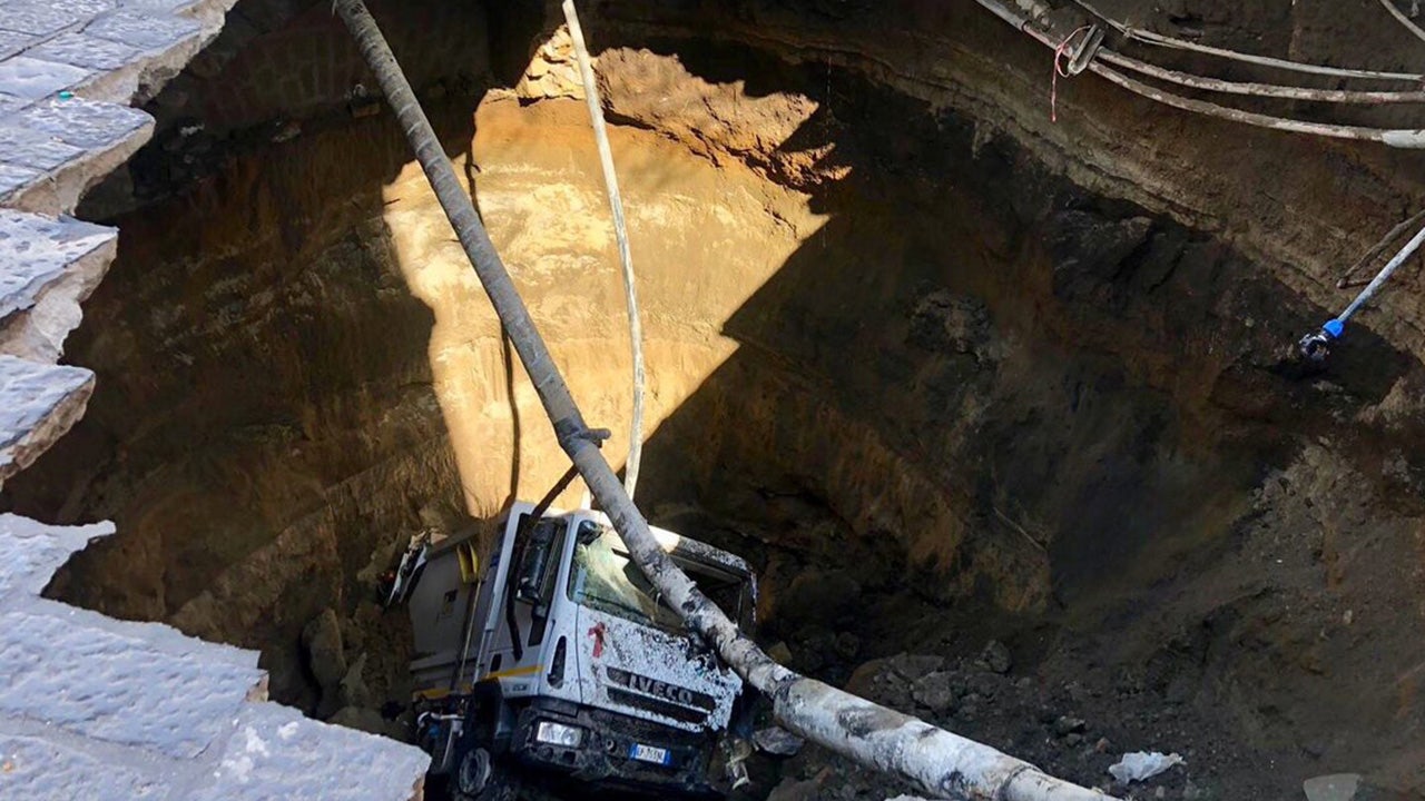 The truck was traveling down the Casoria area of the southern Italian city when the ground beneath it opened up. Much of the vehicle was left buried under dirt and rubble as a result of the collapse.