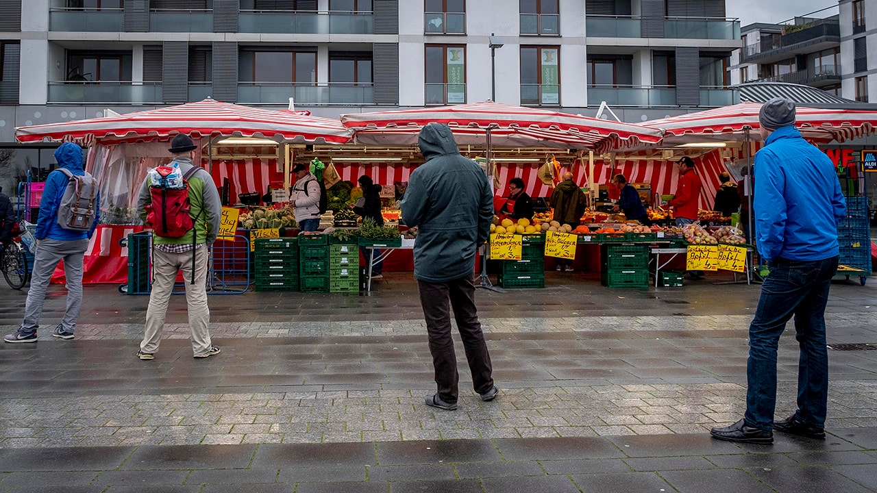 People keep distance as they queue on a small weekly market in Frankfurt, Germany, early Saturday, March 21, 2020. For most people, the new coronavirus causes only mild or moderate symptoms, such as fever and cough. For some, especially older adults and people with existing health problems, it can cause more severe illness, including pneumonia. (AP Photo/Michael Probst)