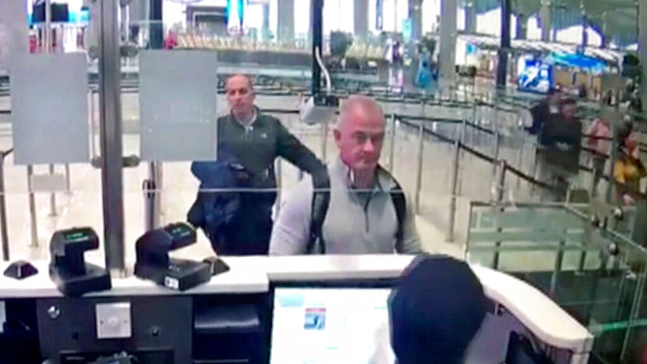 This Dec. 30, 2019 image from security camera video shows Michael L. Taylor, center, and George-Antoine Zayek at passport control at Istanbul Airport in Turkey. (DHA via AP)