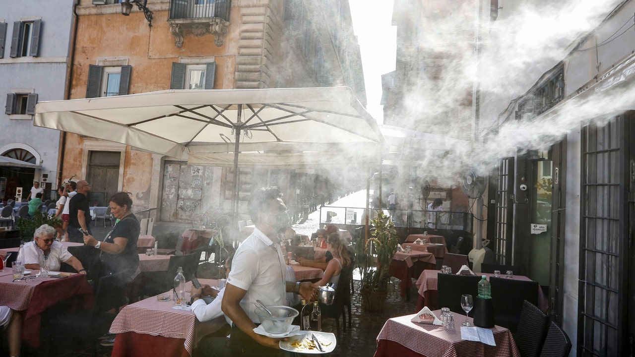 A fan sprays water as customers sit outside a cafe in downtown Rome, Friday, July 31, 2020. (AP Photo/Riccardo De Luca)