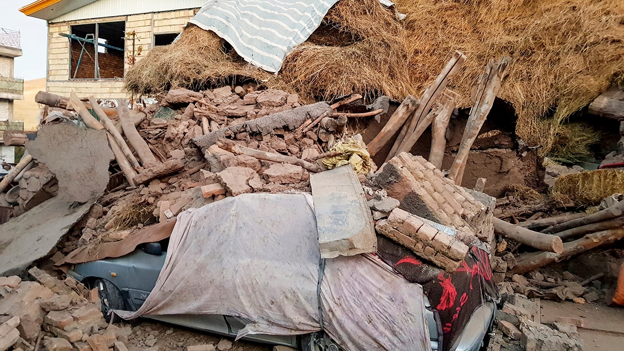 A car lays smashed by debris from an earthquake in Varankesh village in Eastern Azerbaijan province, some 250 miles (400 kilometers) northwest of the capital Tehran, Iran, Friday, Nov. 8, 2019. The temblor struck Tark county in Iran's Eastern Azerbaijan province early Friday. (Mohammad Zinali/Tasnim News Agency via AP)