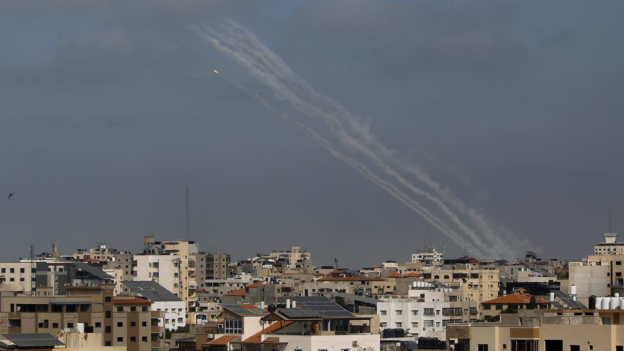A rocket is launched from the Gaza Strip towards Israel, in Gaza City, Thursday, May 20, 2021. (AP Photo/Hatem Moussa)
