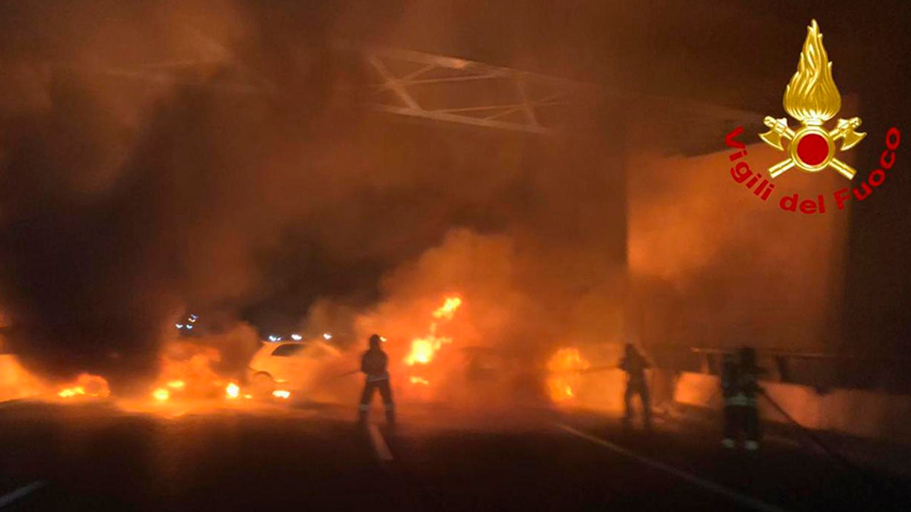 In this photo released by the Italian firefighters, firemen try to extinguish a dozen vehicles on fire on a highway near Milan, Italy, early Wednesday. (AP/Italian Firefighters)
