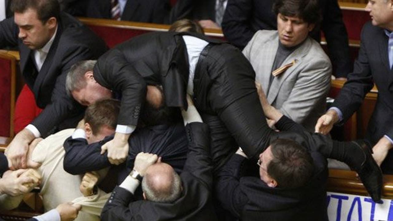 KIEV, Ukraine – KIEV, Ukraine (AP) — The speaker of Ukraine's parliament huddled under umbrellas as eggs rained down and smoke bombs filled the chamber with an acrid cloud. Then the lawmakers attacked each other, punching and brawling in the aisles.