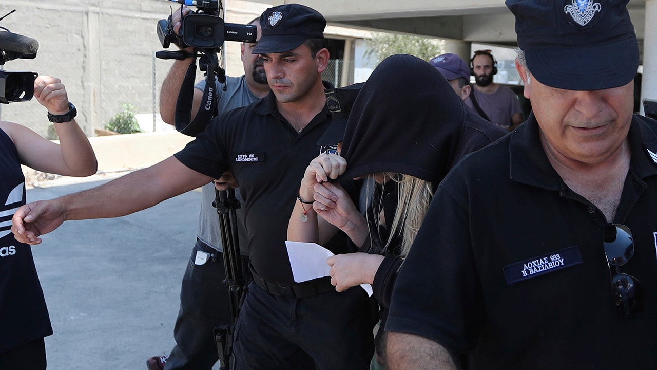 Elite police unit officers escort a 19-year old British woman, center with head covered, to Famagusta court in Paralimni, Cyprus. (AP Photo/Petros Karadjias)