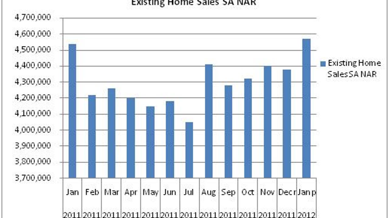 We saw 4.57 million sales in January 2012 up from 4.38 million in a downwardly revised December 2011. This is a 4 percent increase. The “strength” must be judged in the context of mortgage rates at historic lows and below 4 percent. Over a third of sales, 35 percent, involve distressed properties.