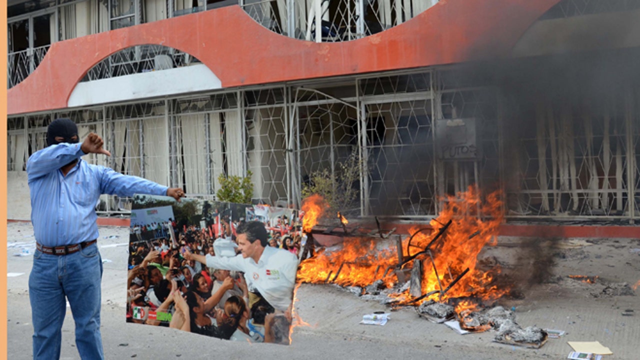 Dozens of teachers carrying sticks and stones smashed windows, spray-painted insults at President Enrique Peña Nieto on walls and destroyed computers and furniture. They set fire to the state headquarters of the ruling Institutional Revolutionary Party and another building.
