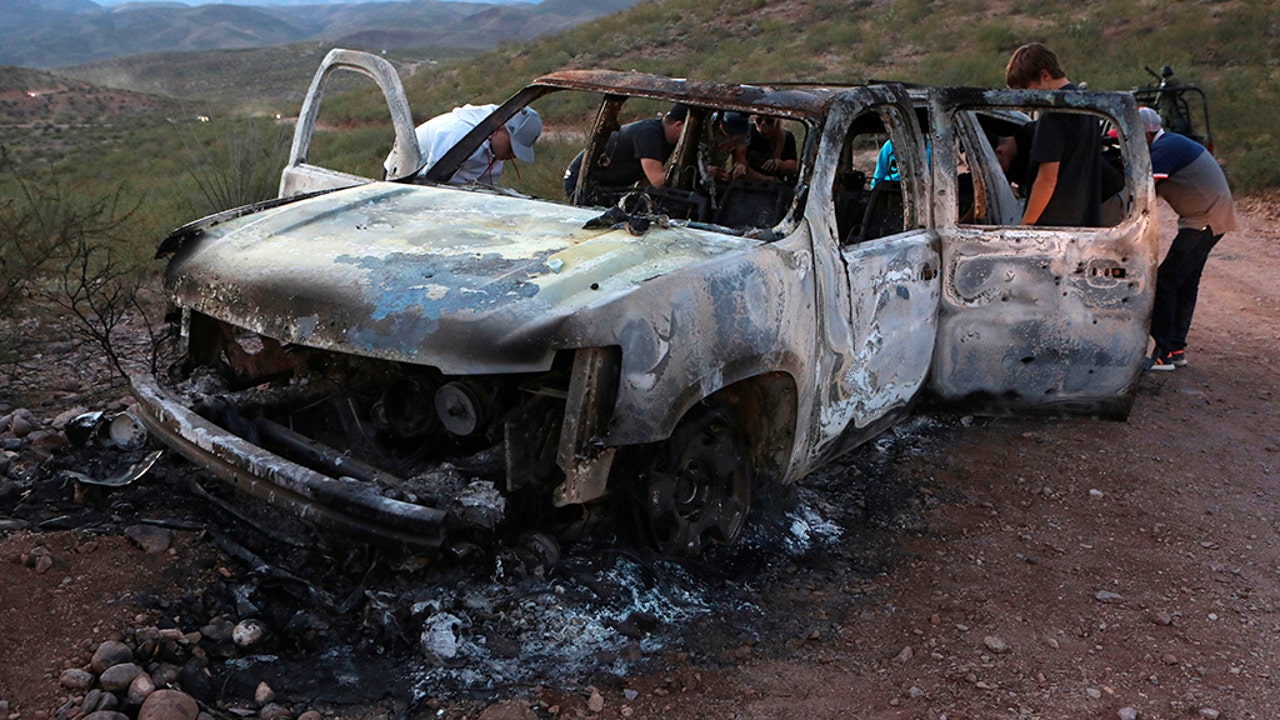 Members of the Lebaron family watch the burned car where part of the nine murdered members of the family were killed and burned during an gunmen ambush on Bavispe, Sonora mountains, Mexico, on November 5, 2019. (AFP via Getty)