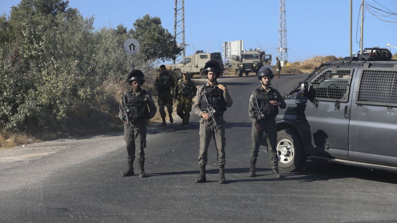 Israeli troops secure the area where a body of a soldier with stab wounds was found near Gush Etzion settlement in the West Bank, Thursday, Aug, 8, 2019. (AP Photo/Mahmoud Illean)