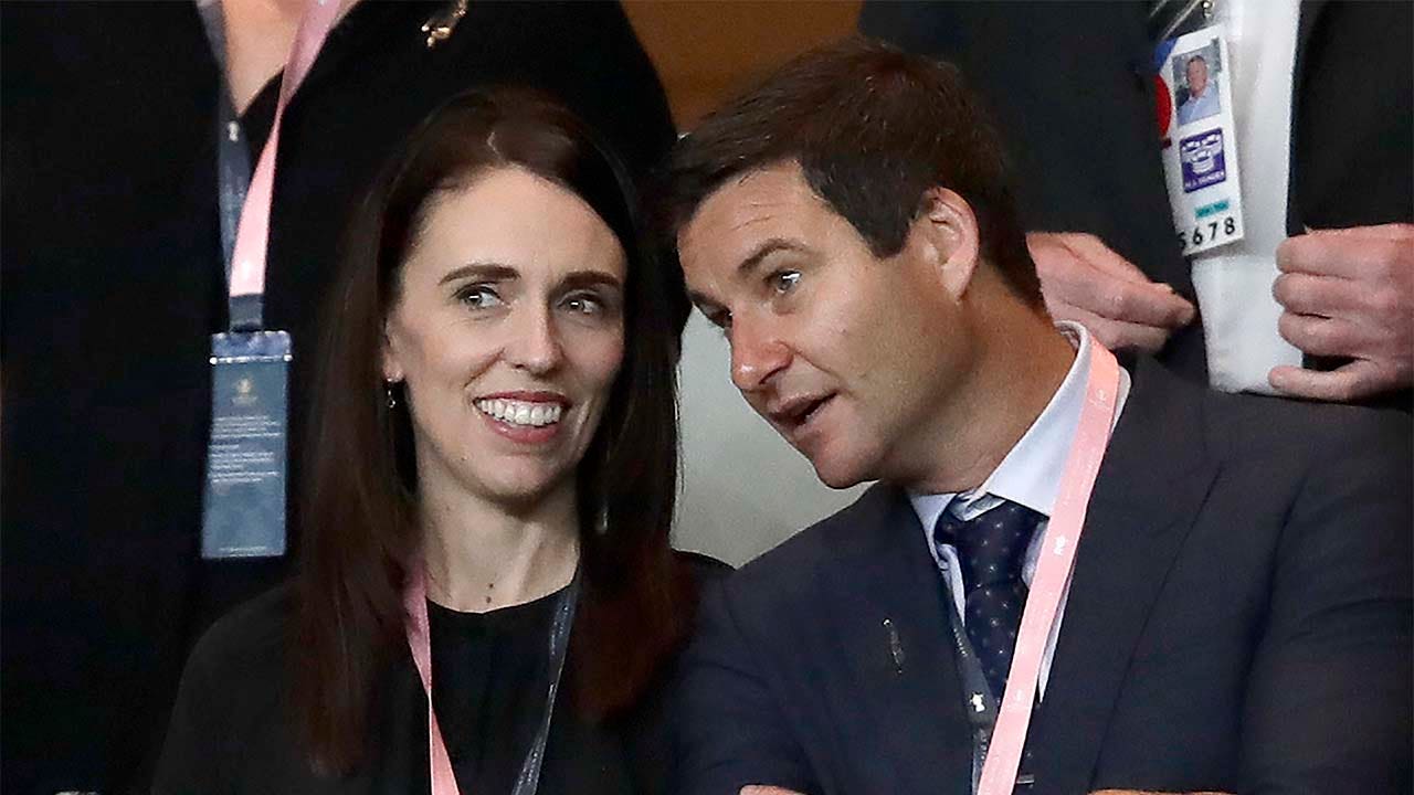 In this Sept. 21, 2019, file photo, New Zealand Prime Minister Jacinda Ardern, left, stands with her fiance Clarke Gayford as they watch rugby in Yokohama, Japan. (AP)
